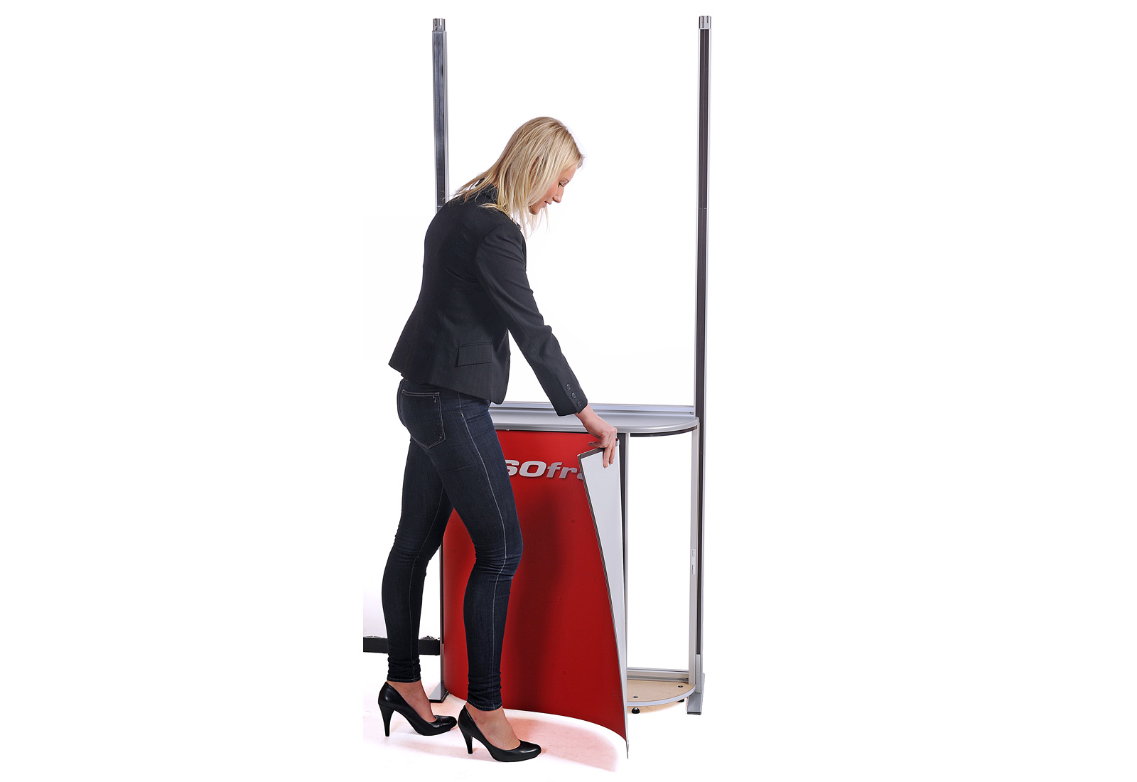 Für die flexible Messestandlösung von ISOframe wave gibt es viel Zubehör und Einzelelemente, um die die Messewand erweitert werden kann. Sehr oft eingesetzt werden die verschiedenen Bildschirm-Module mit Untertischen Keyboard, Tischmodul rechteckig, halbrund oder oval. Des Weiteren gibt es Vitrinen- und Regalmodule in verschiedenen Formen und Ausführungen.