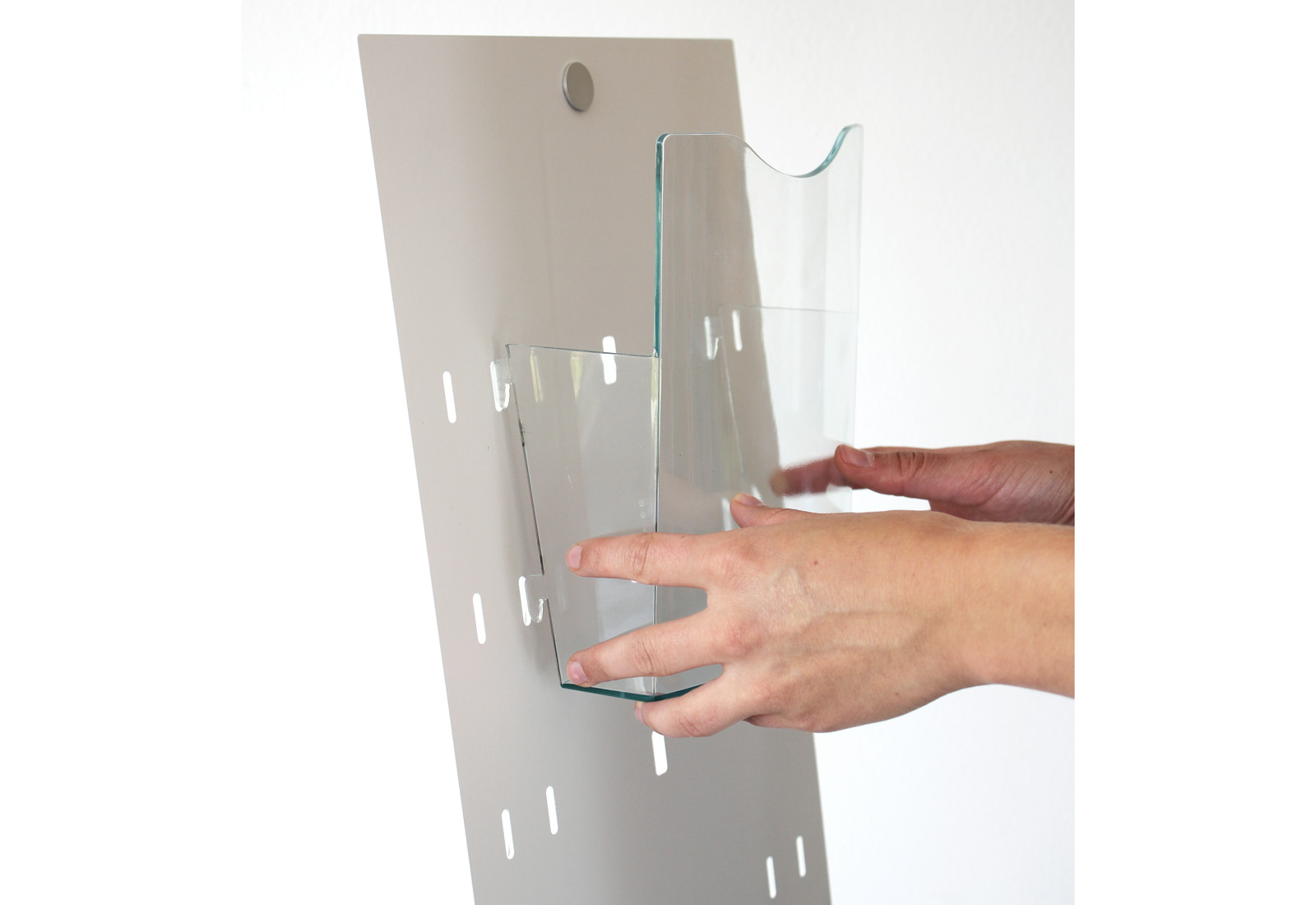 Das Alu-Panel des Prospektständers Velo wurde hier mit einer speziellen Fräsung versehen, damit Zubehör wie Polycarbonat-Prospekttaschen in DIN A4 und DIN A5 eingehängt werden können. So kann Velo für verschiedene Anwendungen immer wieder individuell bestückt werden.