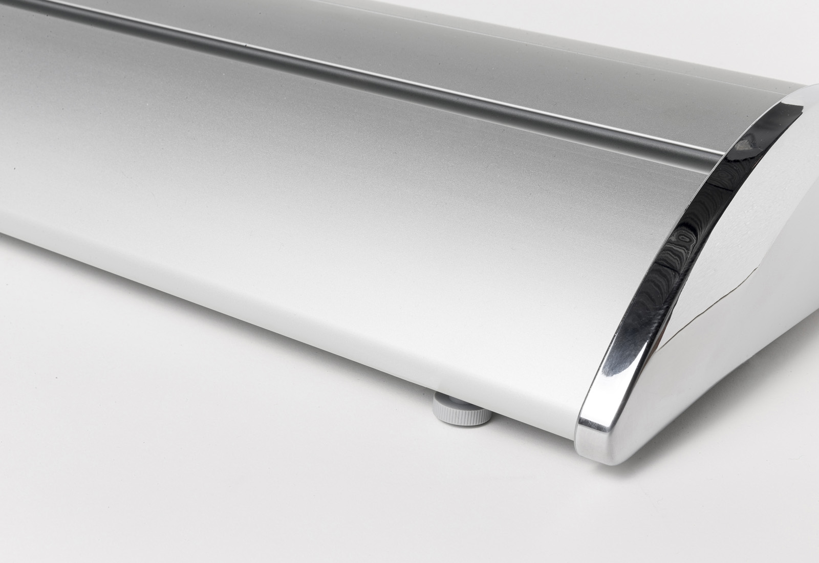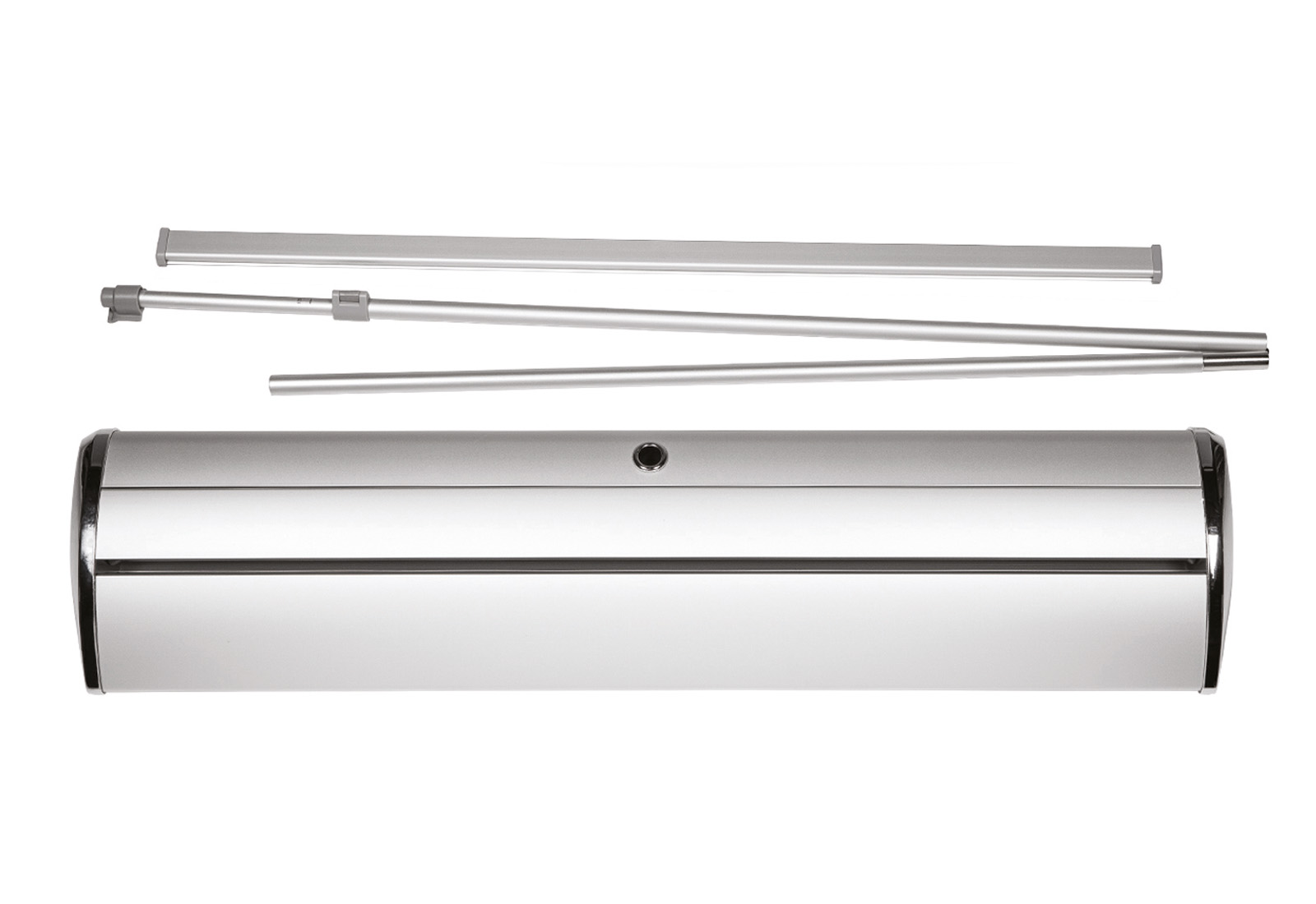 Bei dem RollUp Deluxe handelt es sich um ein hochwertiges und formschönes RollUp-System. Die Aluminium-Systemkassette verfügt über verchromte Seitenteile und hat einen überaus sicheren Stand.. Das System besitzt an der Unterseite kleine, drehbare Stellfüße, wodurch das System völlig gerade gestellt werden kann. Der Grafikdruck befindet sich geschützt im Standfuß des Systems und wird durch einfaches "Herausziehen" präsentiert. Die Fixierung der Grafik erfolgt durch eine rückseitige Teleskopstange (mögliche Systemhöhe dadurch von 160 cm bis max. 225 cm). Ein besonderer Vorteil ist die Möglichkeit, den integrierten Grafikdruck selber leicht wechseln zu können, da das System sowohl oben als auch unten in der Systemkassette über eine Klemmschiene verfügt. Das System wird inklusiv einer doppelt gefütterten Transporttasche ausgeliefert. Der Grafikdruck erfolgt wahlweise auf B1 zertifiziertem Bannersoft-Material 720 dpi, Aluminiummaterial oder Aluminiummaterial mit kratzfester Schutzfolienbeschichtung 1200 dpi. Bei Bedarf kann kann der Grafikdruck natürlich durch einen neuen, aktuelleren Druck ersetzt werden. So kann ein und dasselbe System über viele Jahre hinweg eingesetzt werden.