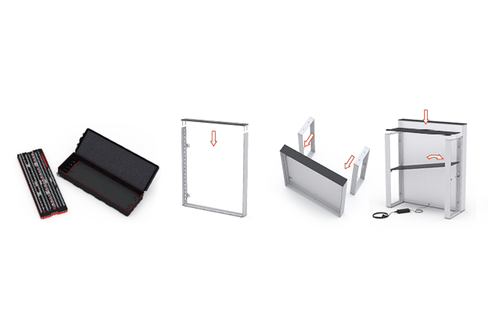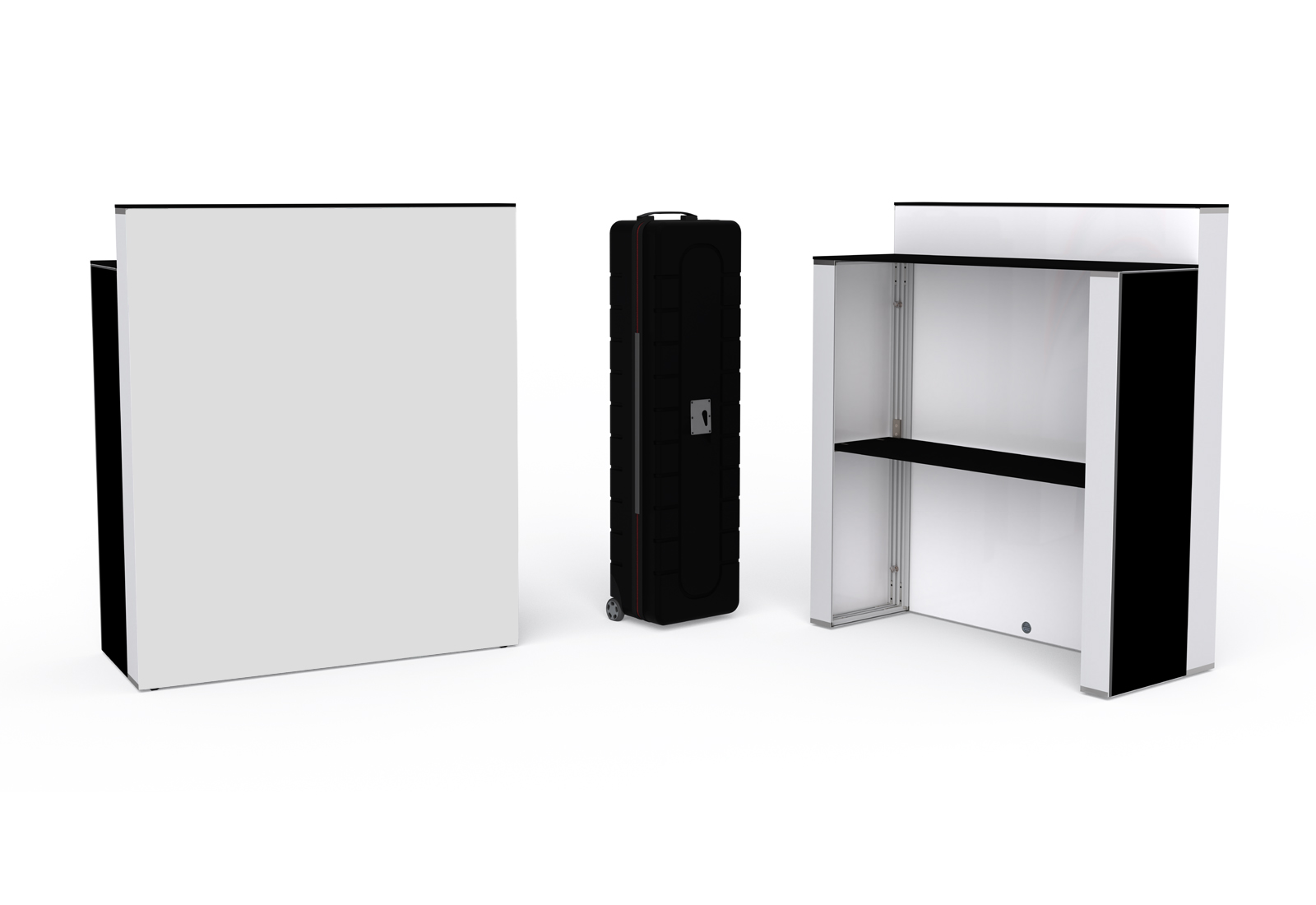 Der Transport des LED-Counter erfolgt in einem rollbaren ABS Transportkoffer (Format 116x30x39 cm). Das Gesamtgewicht der Theke mit Transportkoffer beträgt etwa 34 kg. Die Belastbarkeit der Thekenplatte beläuft sich auf 20 kg, die des Ablagebodens auf 10 kg.