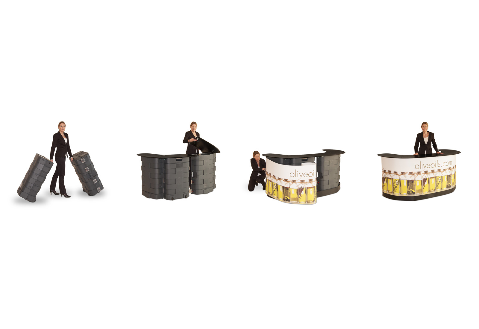 Zwei Expand PodiumCase Boxen können zu einer extra großen Theke verwandelt werden können. Dazu brauchen Sie nur die Boxen zu öffnen und durch Montage der schwarzen Thekenplatte diese miteinander verbinden. Anschließend werden die Sockelblende, die großflächige Thekenummantlung und die Einlegeböden angebracht. Die Theke bietet einen geräumigen Stauraum bei Messen und sonstigen Veranstaltungen. Auf der Rückseite der Theke befinden sich herausnehmbare Regale, die optional hinzu bestellt werden können. Diese bieten ausreichend Stauraum für Ihre Broschüren und anderes Werbematerial. Für den bequemen Transport sind die Thekenkoffer mit Rollen ausgestattet.