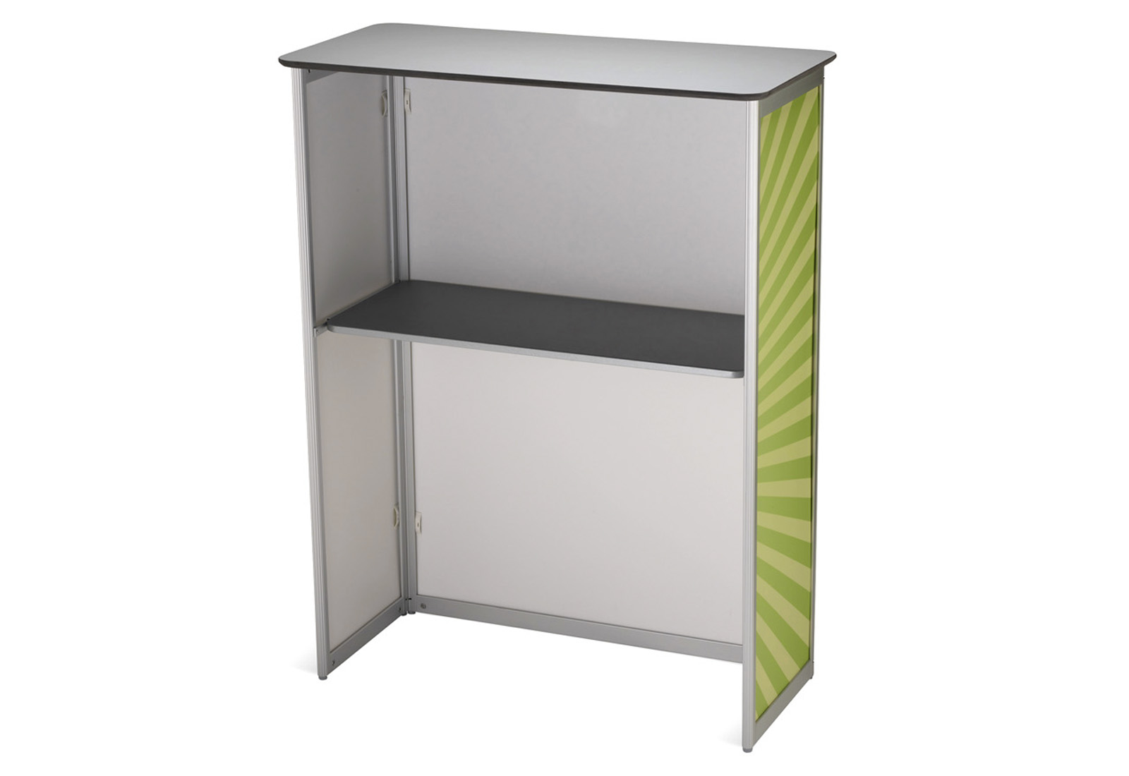 Die Stand Up Theke des Markenherstellers Expolinc ist der ideale Meeting-Point bei Messen, Veranstaltungen und Events. Sie ist ein perfekte Platz, um Verkaufsgespräche zu führen und gleichzeitig bietet sie ausreichend Präsentationsfläche für Werbebotschaften und Logos. Die Stand Up Theke ist in zwei Ausführungen erhältlich: Die rechtwinklig Stand Up Infotheke oder die rautenförmige Universal Theke. Beide Modelle bestehen aus einem Aluprofil mit integrierten Hartschaumplatten, die mit Grafik bedruckt werden können. Beide Thekenmodelle sind leicht zu montieren und besitzen eine stabile Konstruktion. Die Thekenplatte ist silbergrau. Im Lieferumfang enthalten ist auch ein Einlageboden und die Transporttasche.
