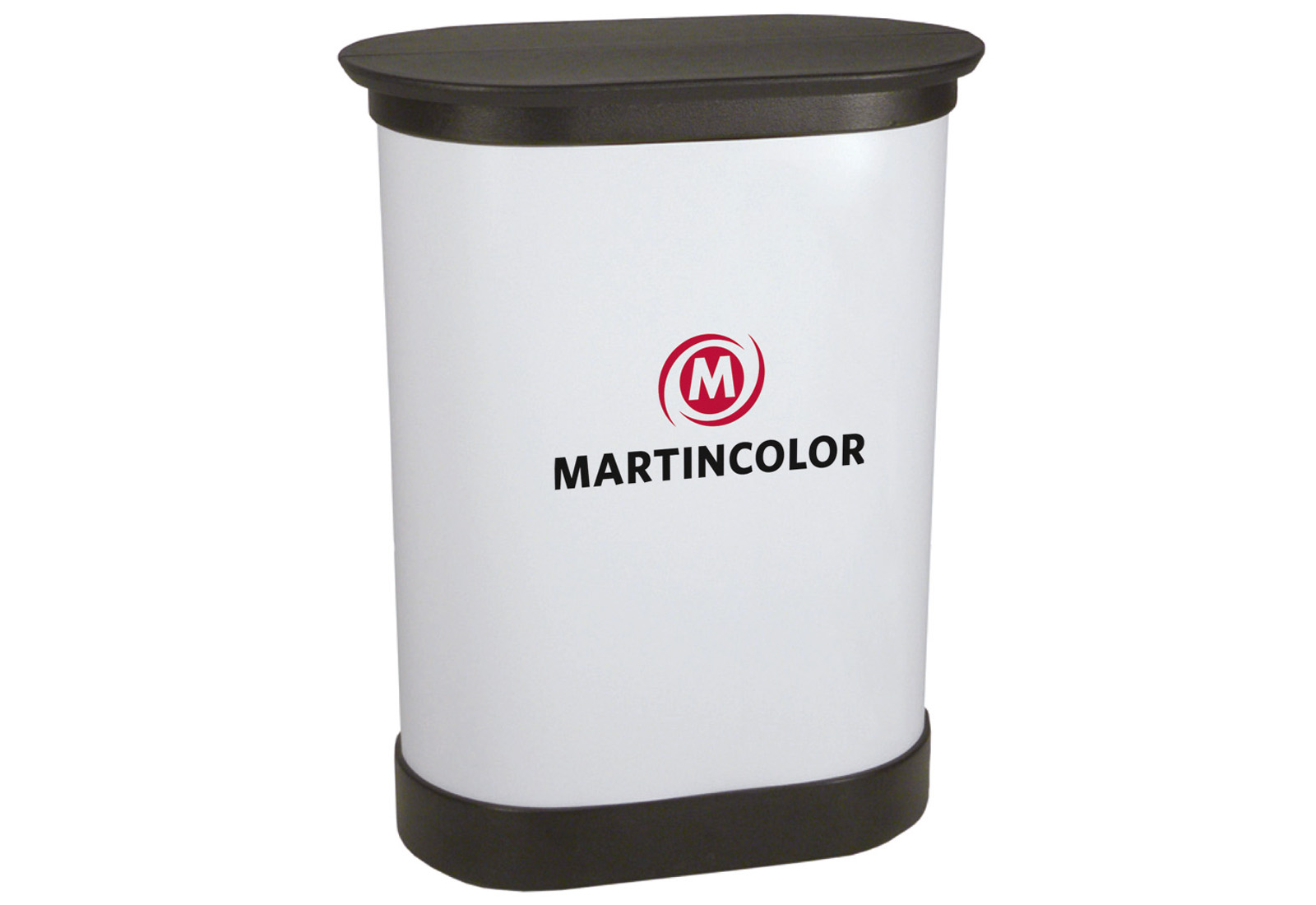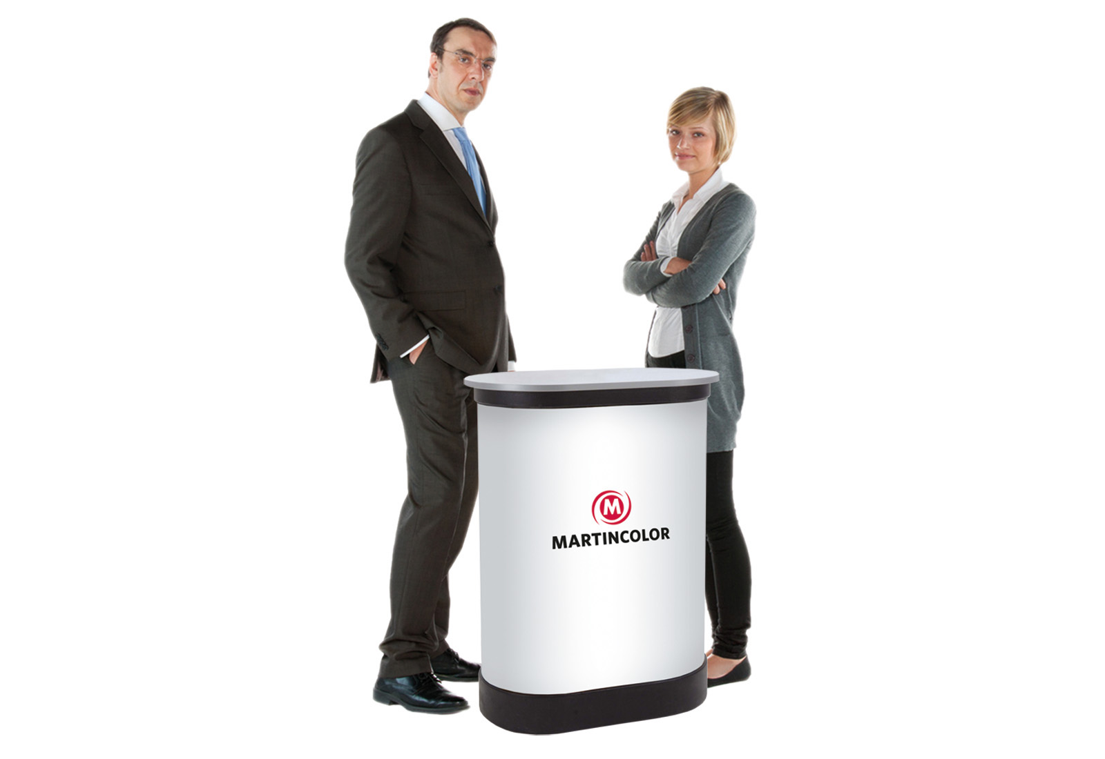 Der Transportkoffer PRO ist Theke und Rollkoffer in Einem. Der Rollkoffer ist groß genug um eine Scherengitter-Faltwand TravelStand PRO zu transportieren. Während Ihrer Messe oder Ausstellung kann der Transportkoffer dann sekundenschnell als Theke umgebaut werden. Eine individuelle Grafikbanderole wird um den Kofferkorpus gelegt und mittels Klettband befestigt. Die mitgelieferte Thekenplatte ist klappbar und aus diesem Grund leicht im Korpus verstaubar. Sie ist in den Oberflachen silber, schwarz, weiß und holzfarben erhältlich.