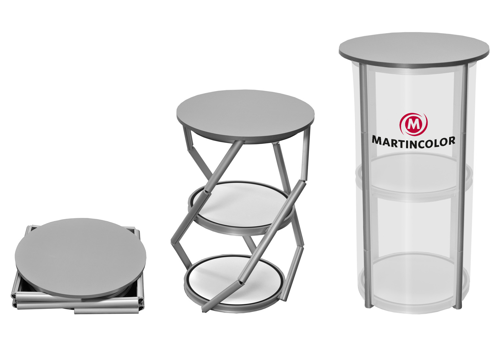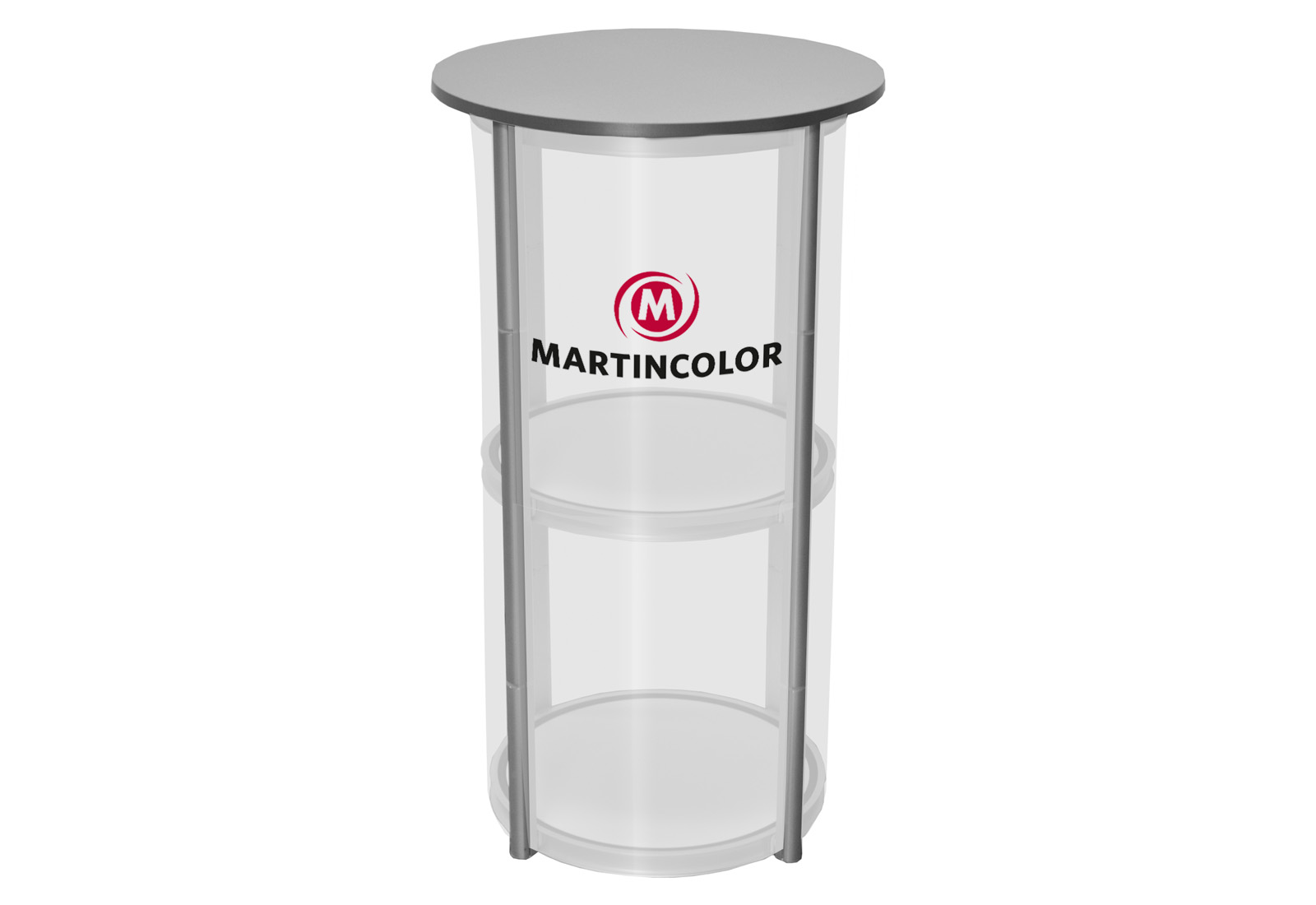 Bei der Twist Theke handelt es sich um eine außergewöhnliche Präsentationstheke, die sich sowohl als flexible Messetheke als auch als personalisierter Stehtisch verwenden lässt. Und der Clou: Die Twist Theke bzw. Stehtisch ist mit einer einzigen Drehbewegung einsatzfertig aufgebaut. Das System lässt sich komplett mit 8 bedruckbaren Click-Panels im Format 38,8 x50 cm bestücken. Alternativ kann man auch transparente Panels einsetzten und so Teile der Theke als Vitrine nutzen. Die Twist Theke verfügt über einen Einlegeboden, der mit der Thekenstruktur fest verbunden ist. Das Thekenmodell ist als Komplettsystem mit Tischplatte auf Kleinstmaß zusammenfaltbar! Der Transport der zusammengefalteten Theke erfolgt in einem Trolley. Twist besitzt einen Durchmesser von 58 cm und eine Höhe von 106 cm. Das Gewicht der Theke beträgt inkl. Grafik 18 kg. Die Belastbarkeit der Theke beträgt insg. 50 kg. Der Zwischenboden kann mit 15 kg belastet werden.