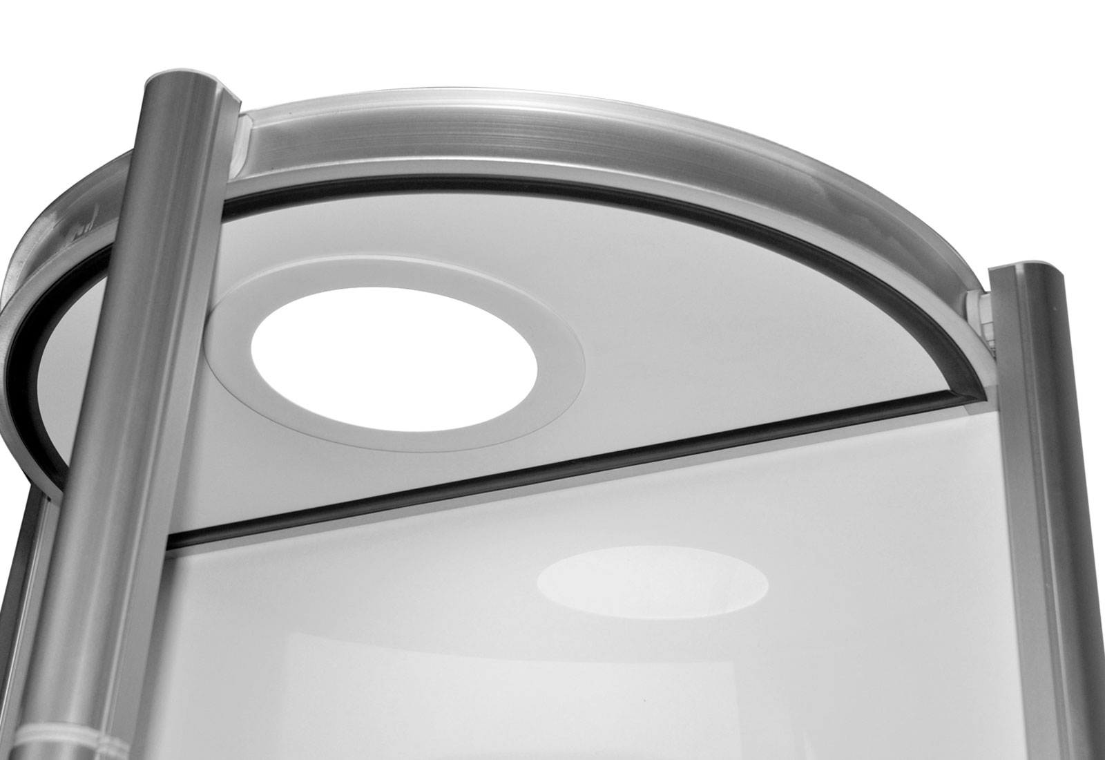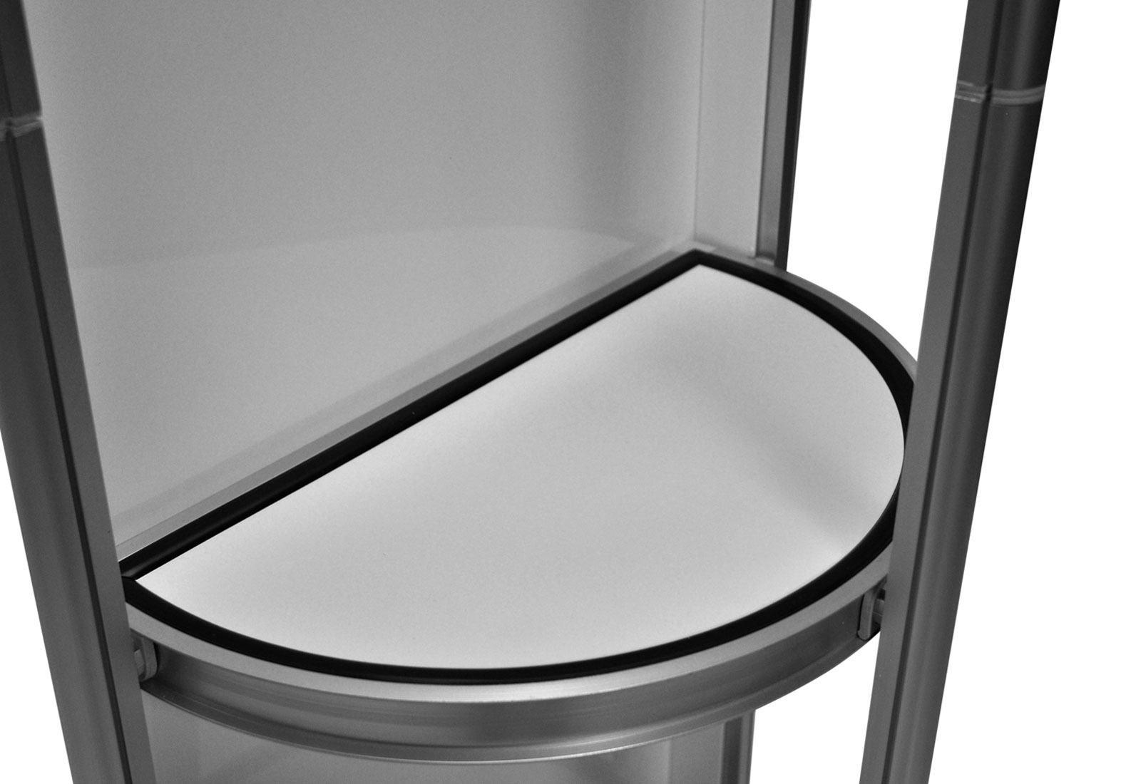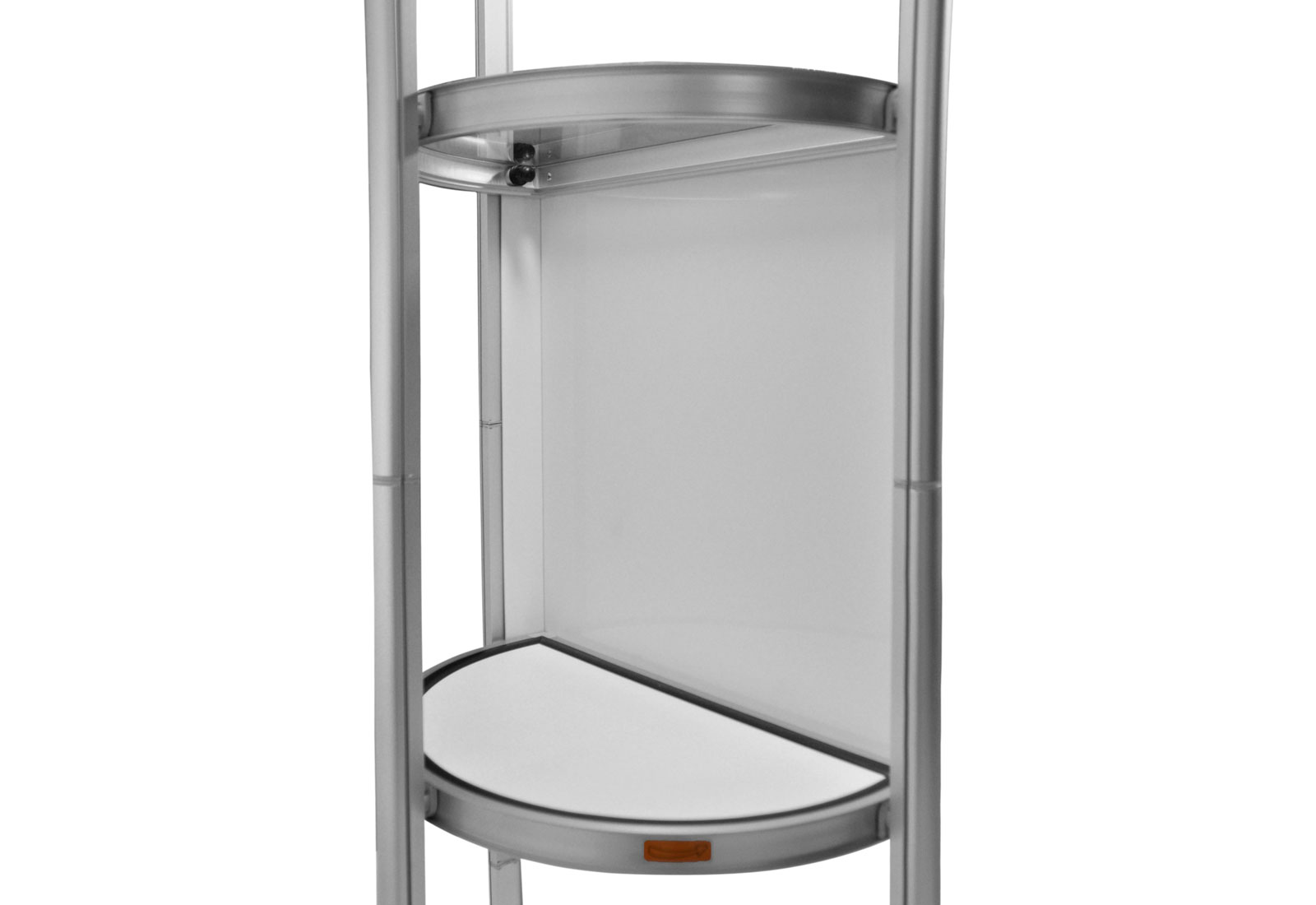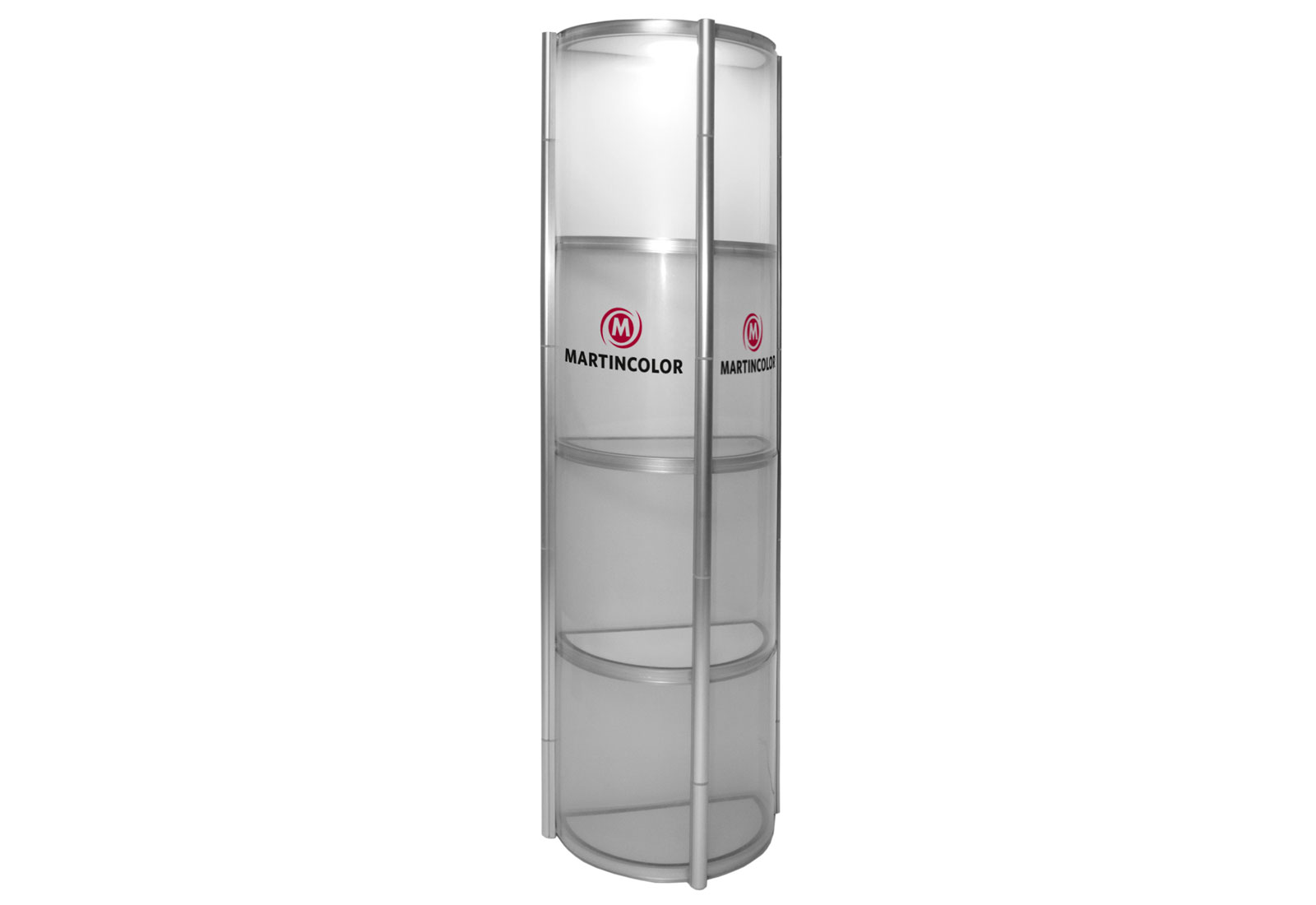 Ganz neu in unserem Programm der faltbaren Vitrinen-Displays ist die halbrunde Twist Säule. Alle Säulen aus der Twist-Familie sind außergewöhnliche Vitrinen-Displays, die zunächst klein zusammengefaltet im Trolley transportiert werden und sich beim Aufbau mit einer einzigen Drehbewegung zu einer hochwertigem Vitrinensäule entfalten lassen. Die Sichtfelder der Vitrinensäule Twist werden mit durchsichtigem Polyester bestückt. Beim Transport hat das große Vorteile gegenüber Glas! Polyester ist strapazierfaähig, transportaben und leicht. Bei Bedarf kann die Säule acuh mit zusätzlichen Grafikpanels bestückt werden um das System zu personalisieren. Alle faltbaren Vitrinen aus der Twist-Familie sind im Top mit einem Power-LED Strahler im Top ausgestattet. Der Durchmesser der halbrunden Twist Vitrinensäule beträgt 56 cm, die Systemhöhe 200 cm und das Gewicht inkl. Panels 35 kg. Jeder Zwischenboden kann mit 15 kg belastet werden.