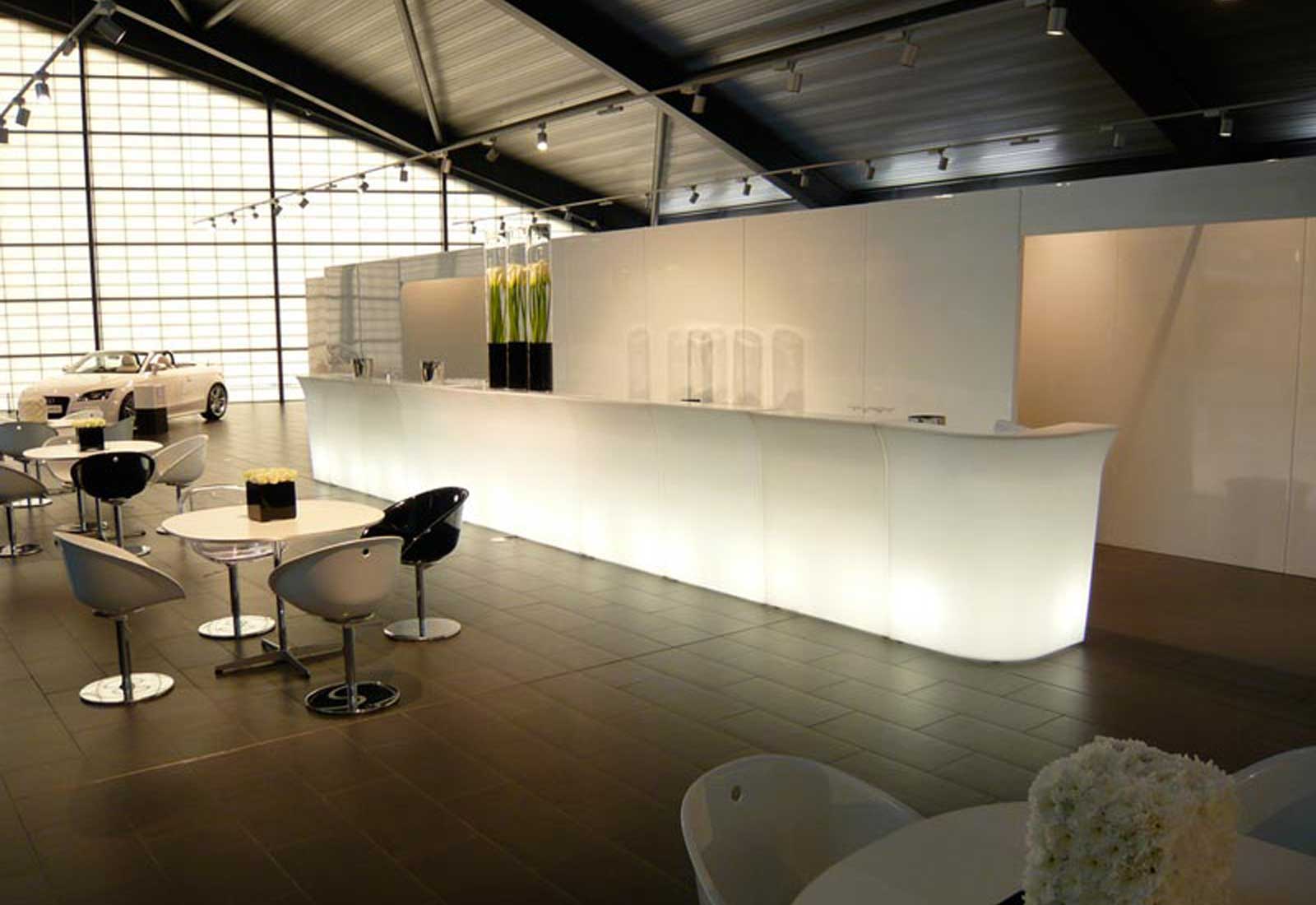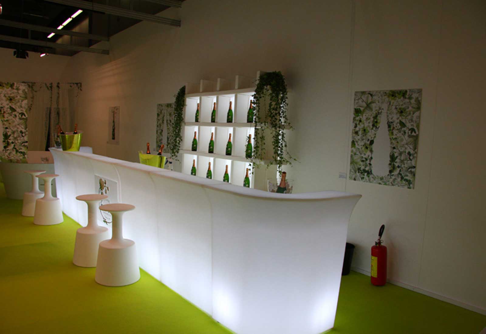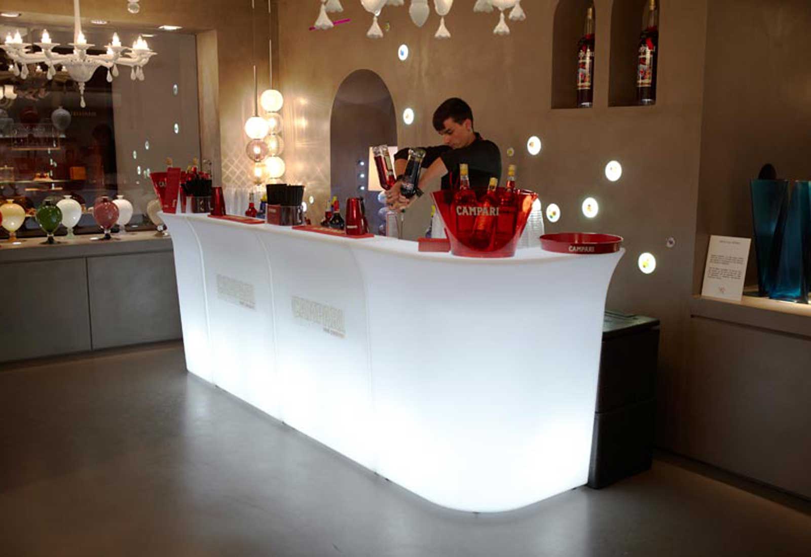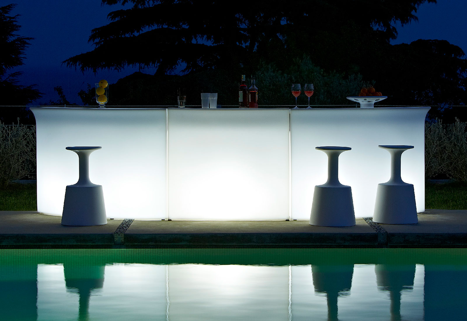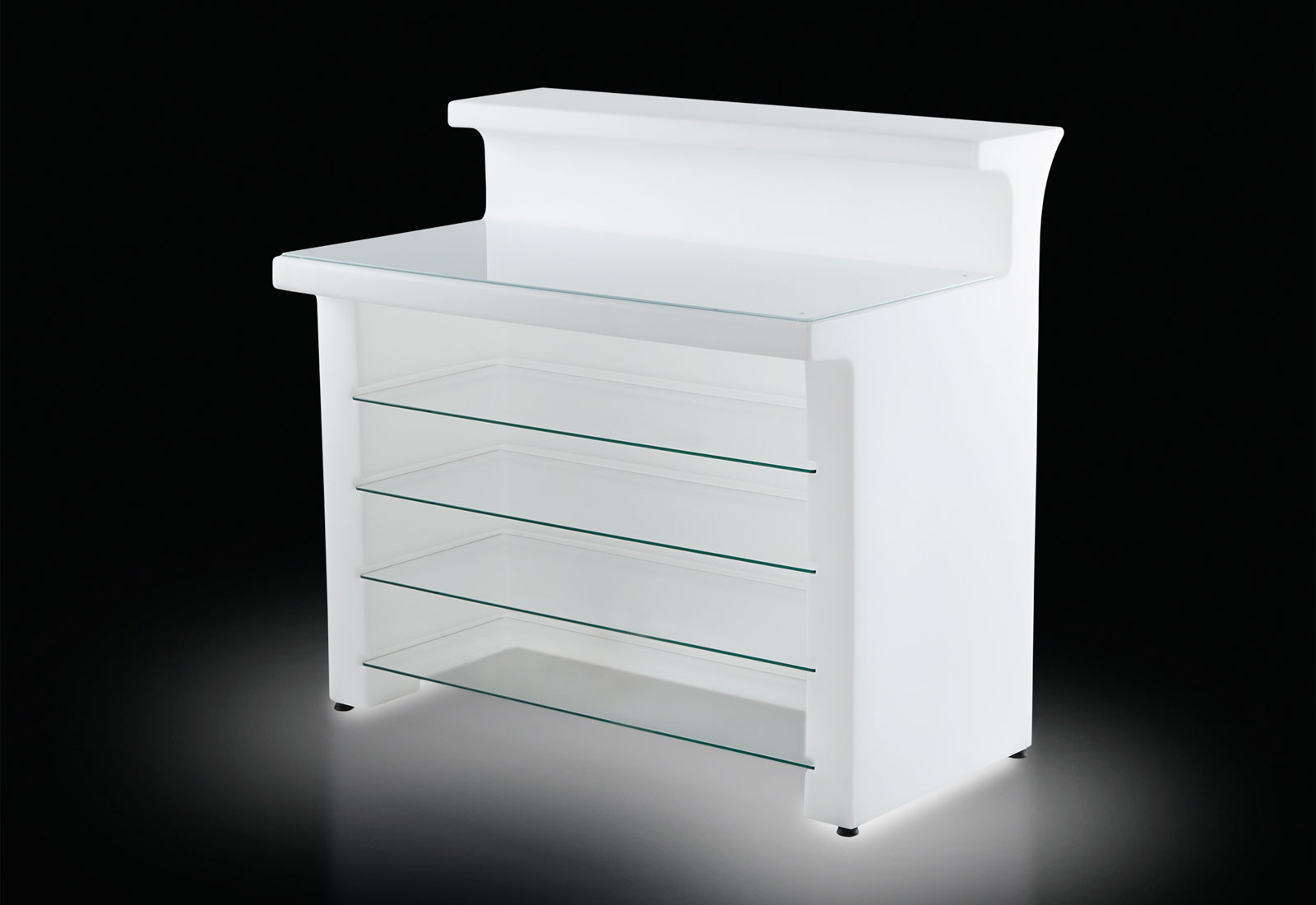 Die Leuchttheke Break Line ist eine Erweiterung der Break-Modultheken. Wie die anderen Leuchtthekenelemente aus der Break-Serie auch (Break Bar und Break Corner) wird diese Theke in Italien gefertigt und überzeugt durch hochwertige Verarbeitung und außergewöhnliches Design. Der Corpus besteht aus wiederverwertbarem Polyethylen, einem temperaturfesten und UV-beständigen Kunststoff, der auch für den Outdoor-Einsatz geeignet ist. Die Theke Break Line ist mit einem Beleuchtungssystem ausgestattet. Die Arbeitsplatte von Break Line besteht wahlweise aus transparentem, gehärtetem und geätztem Glas oder ais Edelstahl.