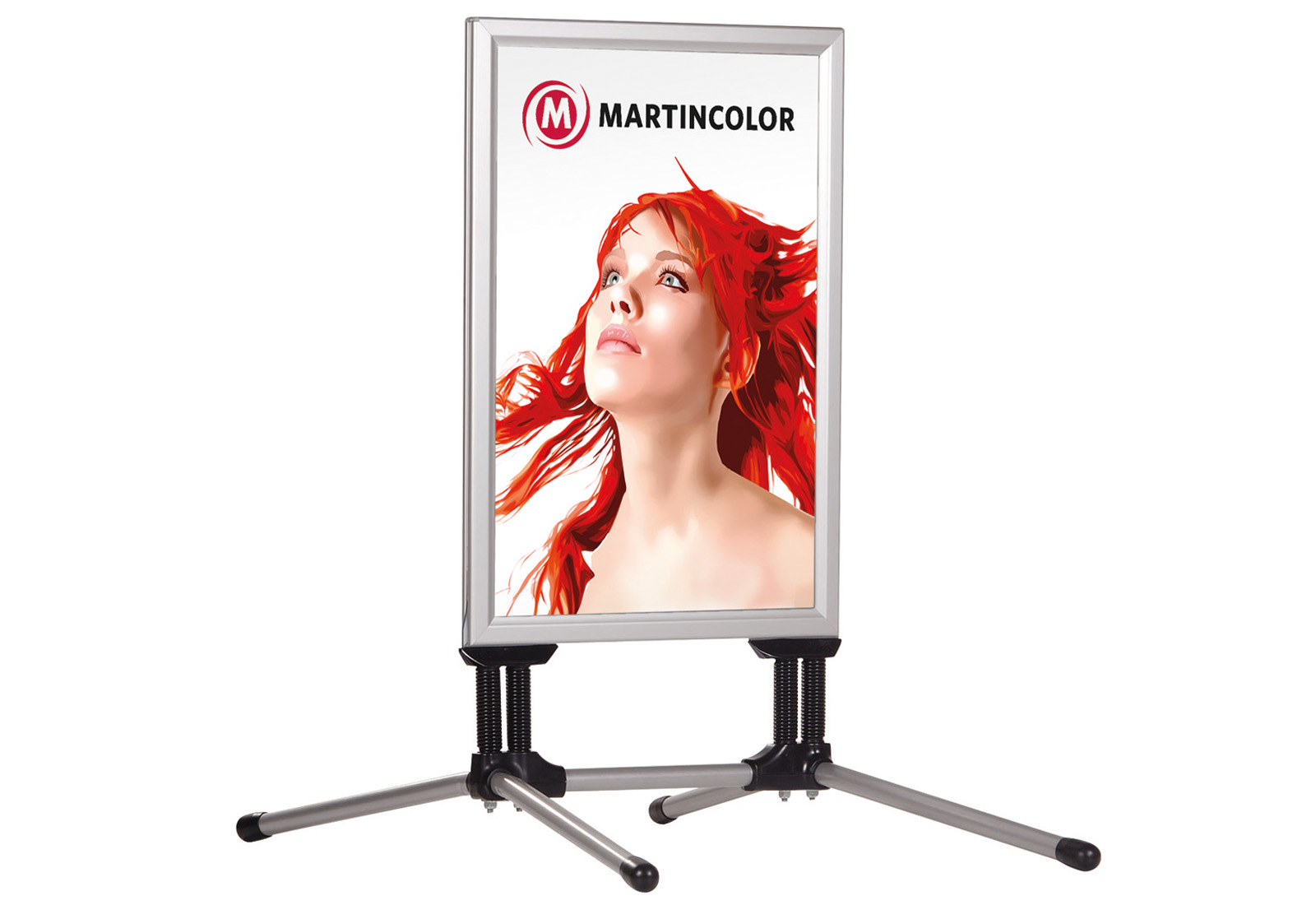 Kundenstopper sind aktive Verkaufshelfer, die niemand übersieht. Der hier vorgestellte, doppelseitige Kundenstopper Swing ist in unterschiedlichen Formaten lieferbar - für Plakate in den Formaten DIN A1 und DIN A0. Diese sind durch Antireflexfolie geschützt. Der Kundenstopper ist durch umlaufende Dichtungen wetterbeständig und hält selbst stärkerem Wind stand. Der weit ausragende Standfuß wird in Einzelteilen geliefert. Diese bestehen aus 5 Stahlrohren, die mit Kunststoffverbindern aneinander gefügt werden. An der Unterseite des Aluminium-Klapprahmens befinden sich 4 bewegliche Federn, die ein Umkippen des Kundenstoppers zusätzlich verhindern.