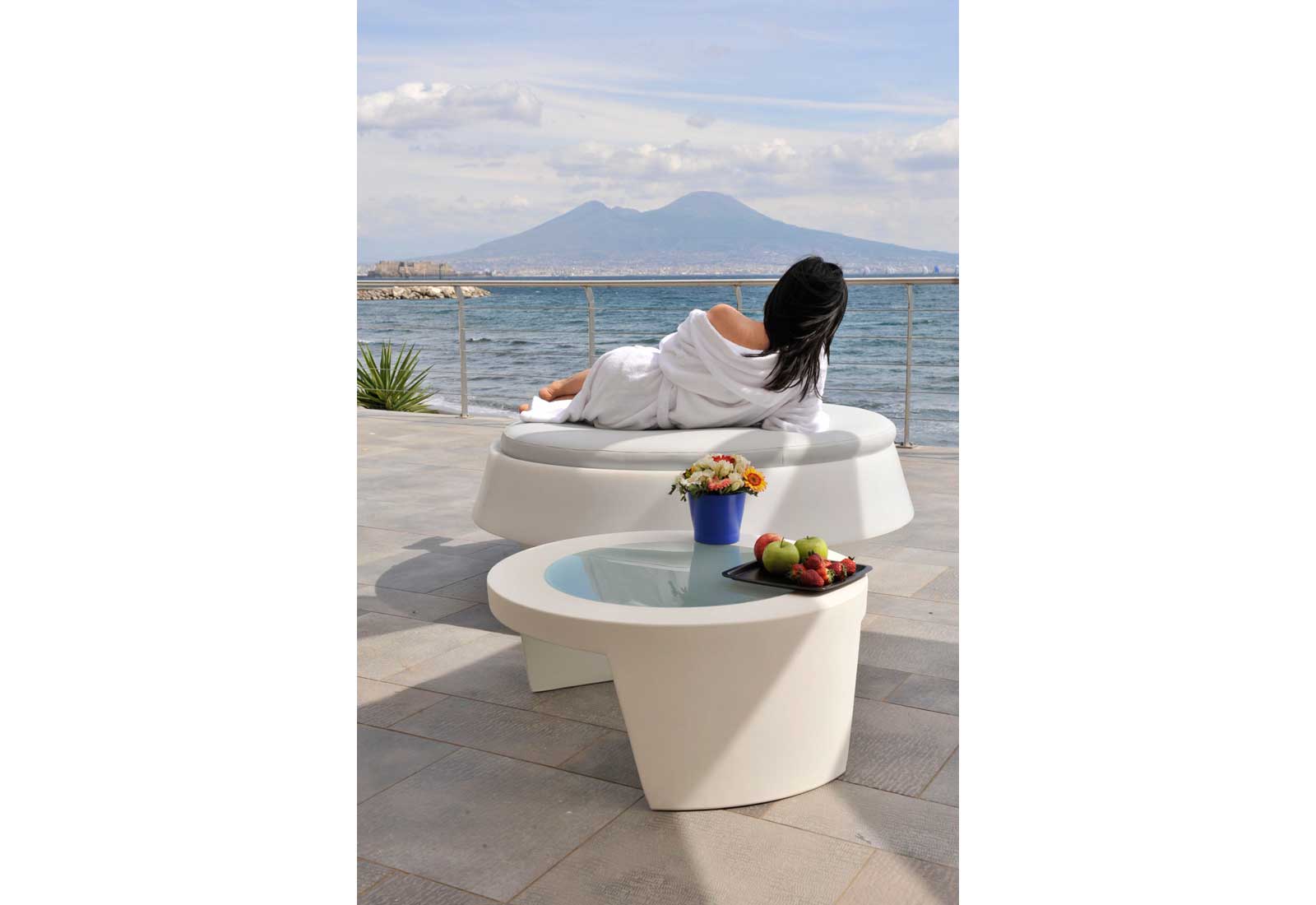 Der Couchtisch "Tao" überzeugt durch klare Linien und ein puristisches Design. Der Korpus ist aus wiederverwertbarem Polyethylen. Der in die Tischplatte eingelassene, opale Glaseinsatz, verleiht dem hochwertigen und eleganten Couchtisch eine besonders edle Note. Wegen seines außergewöhnlichen Designs eignet sich der Tisch "Tao" auch für Messen, Ausstellungen, Events oder für den hochwertigen Launchbereich von Veranstaltungen. Selbstverständlich ist der Beistelltisch "Tao" wetterfest und sowohl im Indoor- als auch im Outdoor-Bereich einsetzbar. "Tao" ist in vielen Farben erhältlich: grün, orange, rot, schwarz, weiß... Der Tischdurchmesser beträgt Ø 80 cm x H 34 cm. Der eingelassene, opale Glaseinsatz hat einen Durchmesser von Ø 57,5 cm.